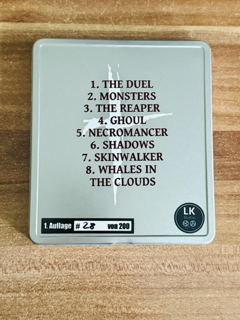 Auf der RĂŒckseite findet sich die limitierte Tracklist, inklusive handnummerierter Auflage (nur 200 StĂŒck!). Im Inneren wartet ein aufwendig gestaltetes Inlay mit Logo-Print, Artwork-Karte und zusĂ€tzlichem Booklet – kleine, aber feine Details, die zeigen, dass hier Herzblut und Handwerk aufeinandertreffen.
